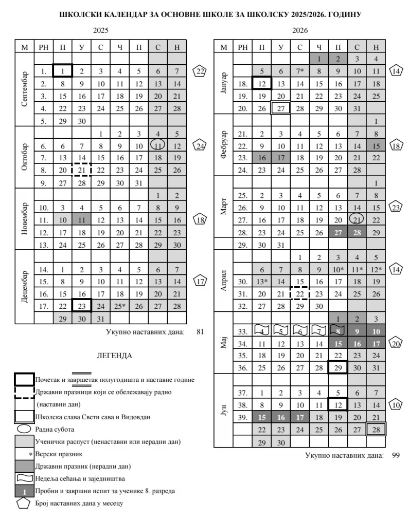 Школски календар 2025/26.