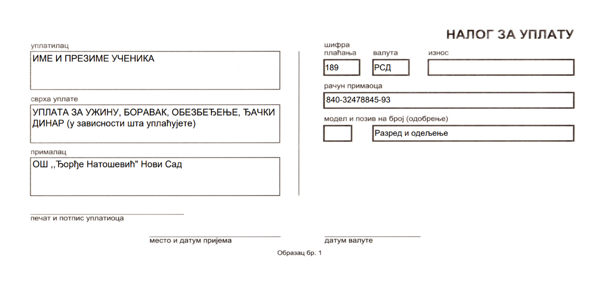 Поштовани родитељи, на слици испод је уплатница за обезбеђење.