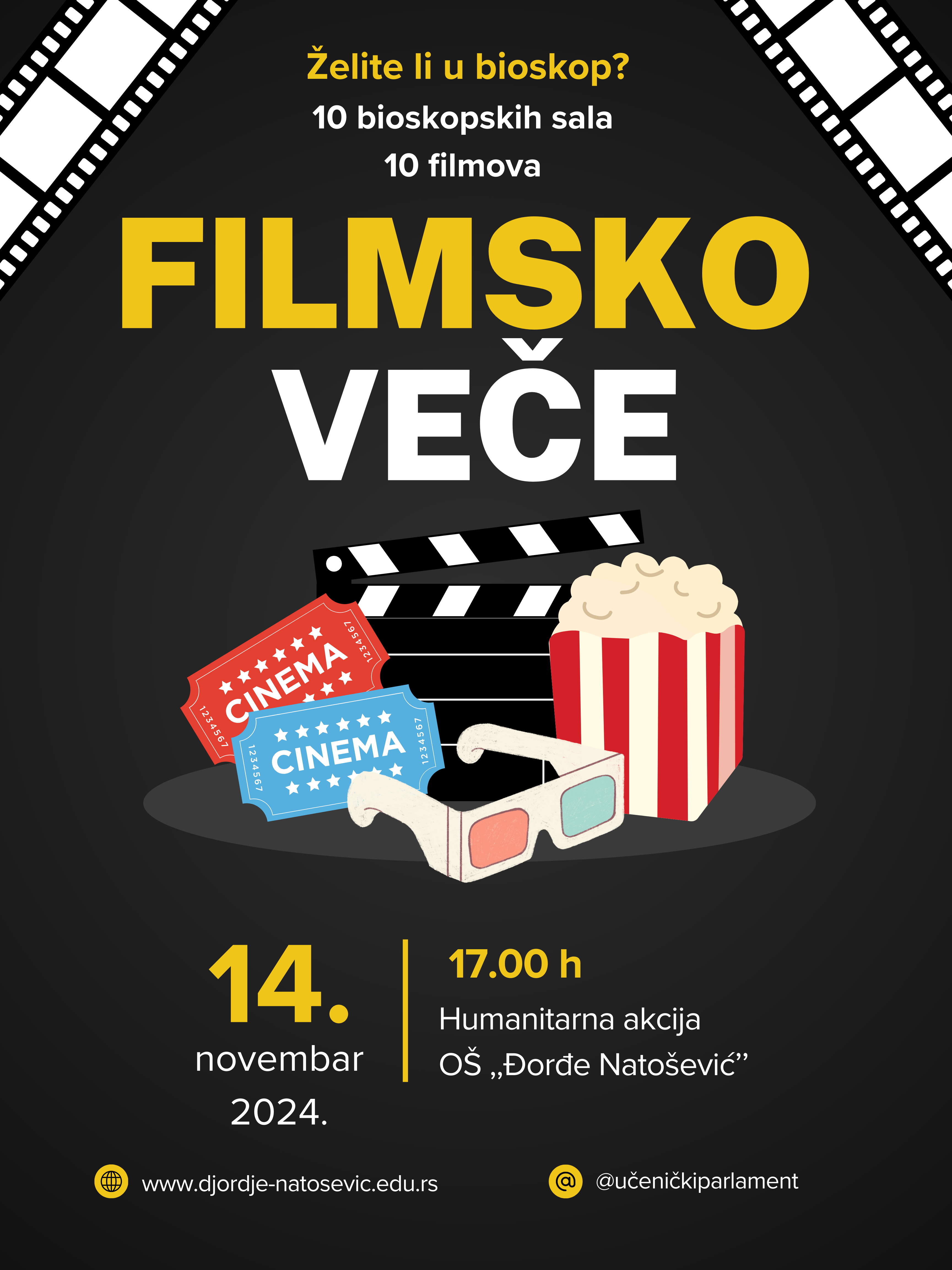 У четвртак, 14. новембра 2024. године у 17.00 часова одржана је хуманитарна акција под називом ,,Филмско вече''. Акцију је покренуо Ученички парламент који је пожелео да школа постане простор у којем ђаци могу на другачији начин да проведу своје време, да се друже, уживају, организују и одлучују, а све са племенитим циљем. Акцији су се одазвали сви ученици наше школе. Десет учионица претворено је у десет биоскопских сала. Сваки ученик могао је да изабере филм по свом избору и купи карту. Најпопуларнији су били филмови на српском језику и те ,,биоскопске сале'' прве су распродате. Наши најмлађи ђаци су са својим учитељицама одгледали филмове по избору у форми матинеа. Пројекције су протекле у највећем реду и сви су се лепо провели. Сакупљена су средства од 315.920,00 динара и уплаћена преко фондације ,,Буди хуман'' маленој Ани Милић. Поносни смо на све наше ученике и захвални њиховим родитељима који су препознали и подржали ову племениту идеју наших ученика.