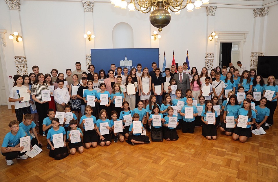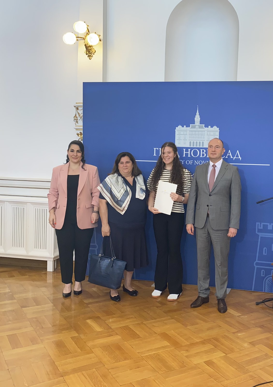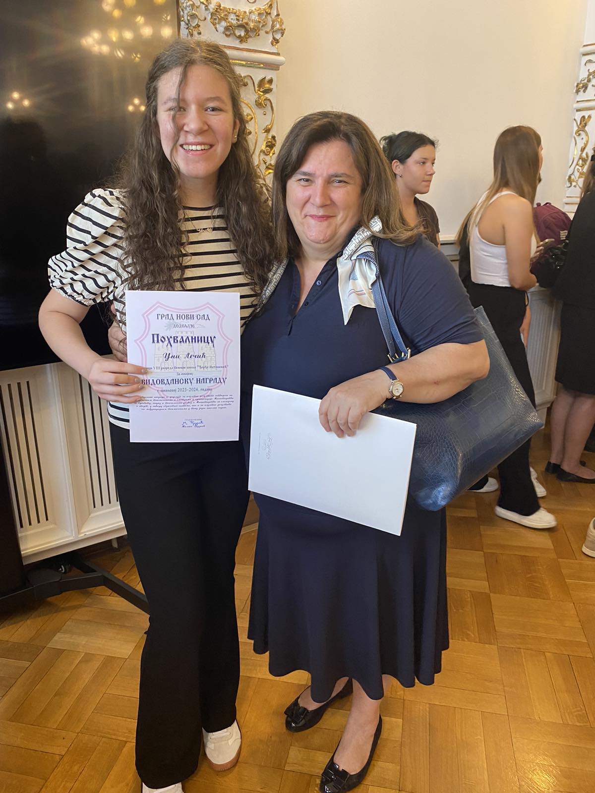 У име свих награђених ученика наше школе похвалнице су од градоначелника преузеле ученица Уна Лечић и наставница Српског језика и књижевности Оливера Ћурчић.
